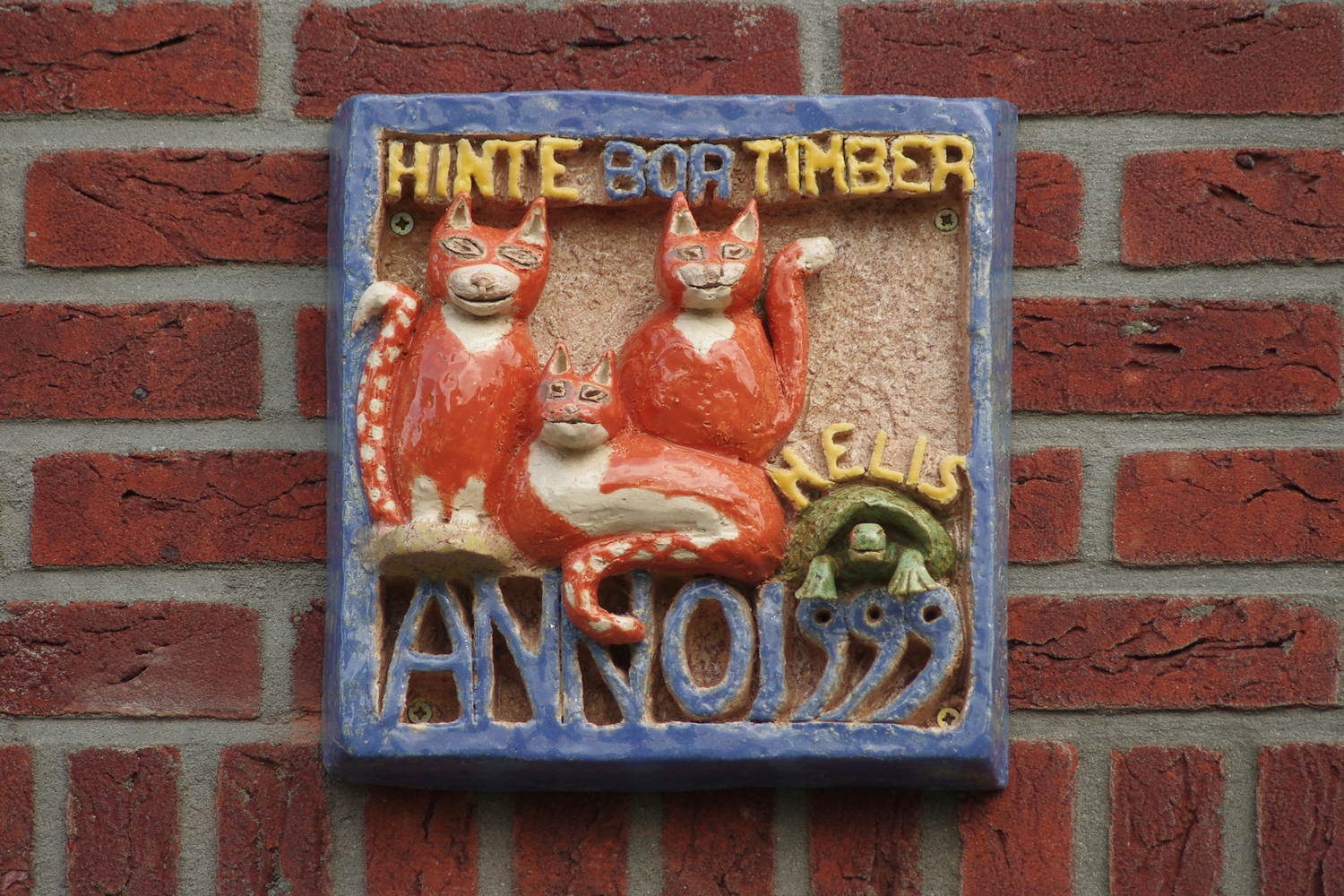 Deze gevelsteen laat niets aan de verbeelding over. Het is een steen met de namen van drie katten te weten; Honte, Bor en Timer. Ook had de eigenaresse, mevrouw Gina Bijl, nog een schildpad, genaamd: Nelis.