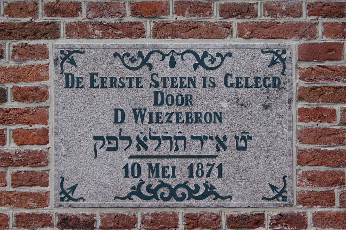 Zoals vermeld op de steen is deze op 10 mei 1871 ingemetseld in de gevel van de tweede synagoge. Voor het verhaal van de eerste Sjoel zie Nobelstraat 22.