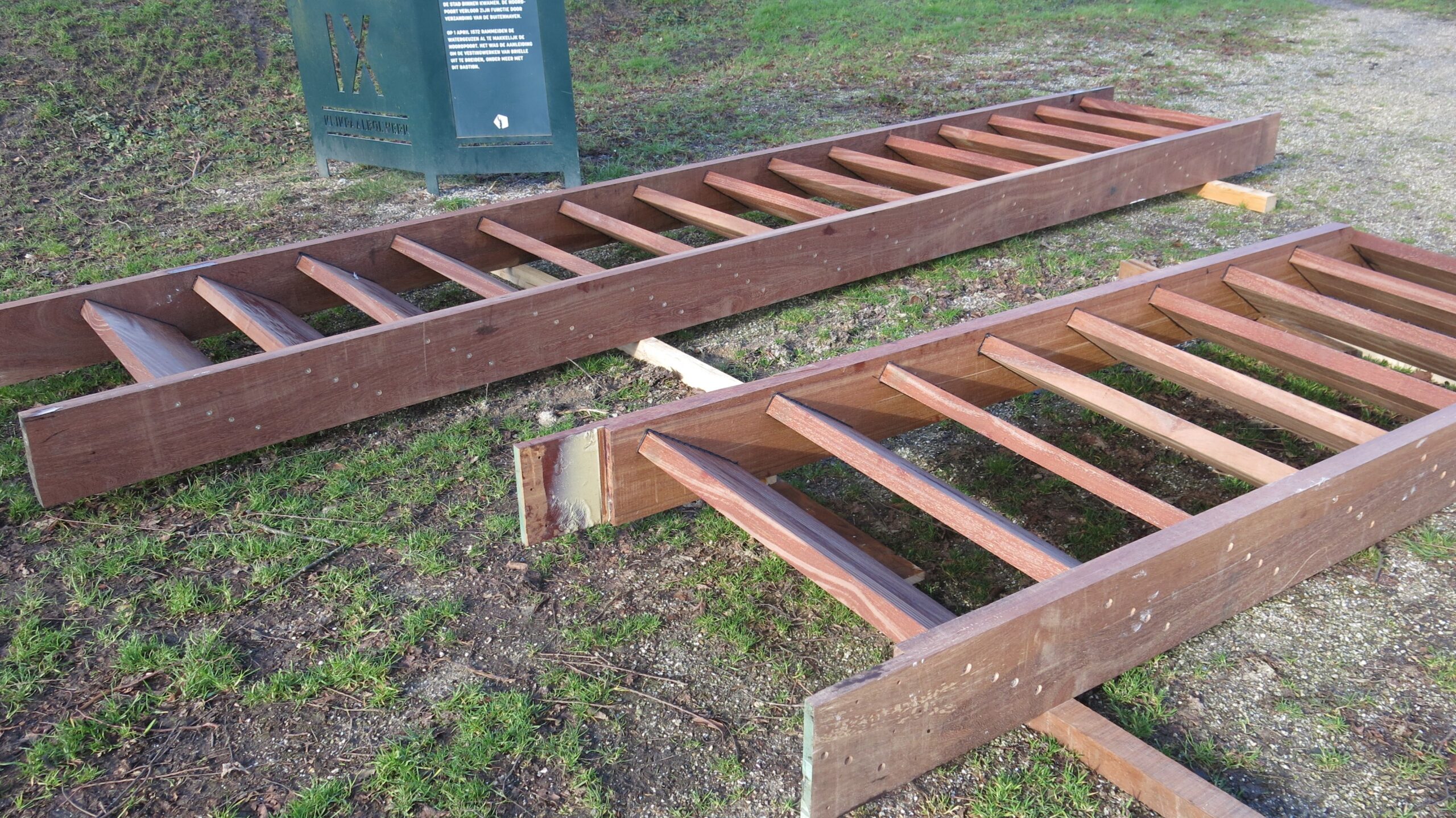 De trap, in twee delen i.v.m. het gewicht, ligt klaar om vervoerd te worden naar Bastion V. Ook het affuit staat klaar om naar het Prikkevest vervoerd te worden.