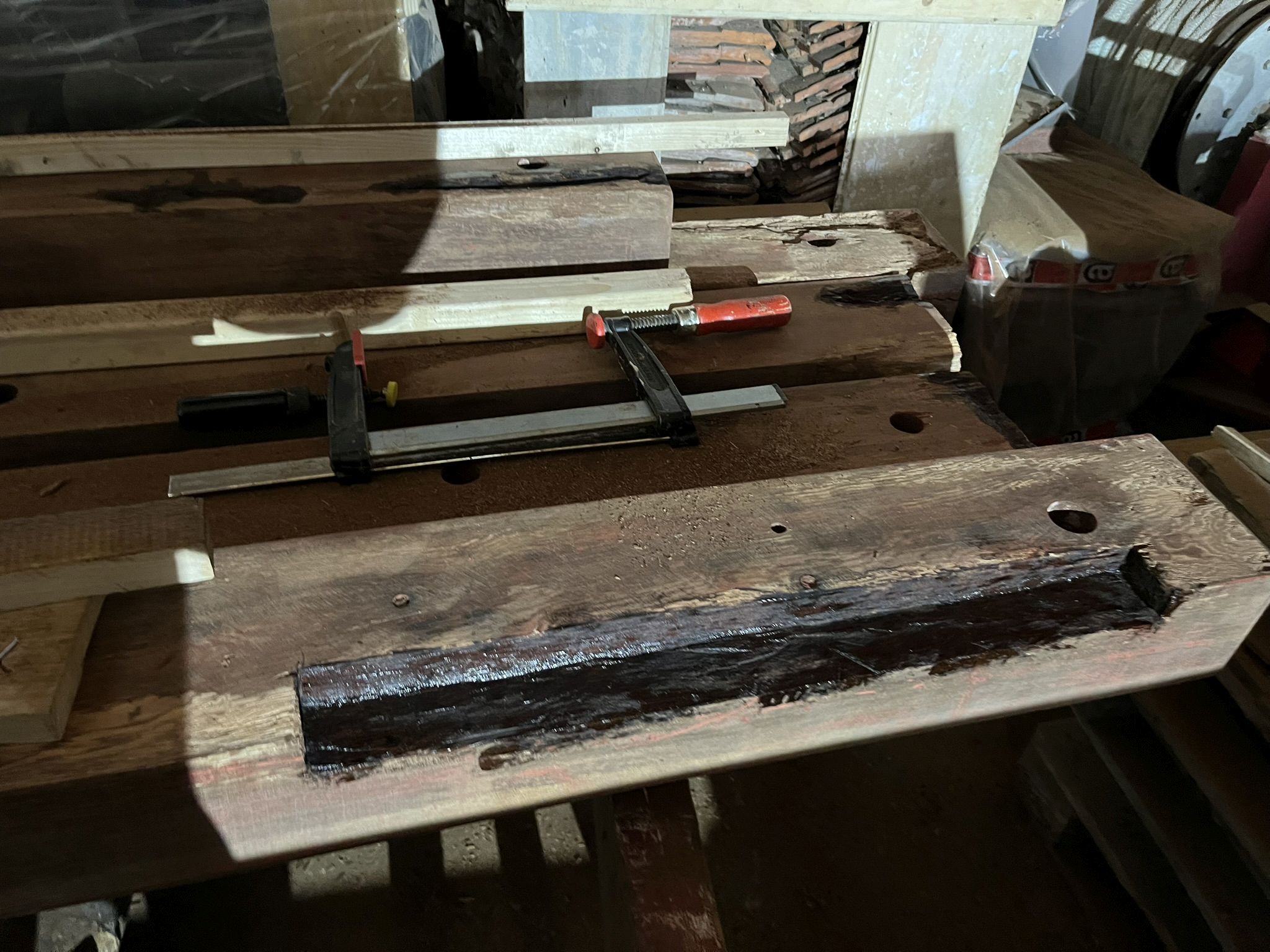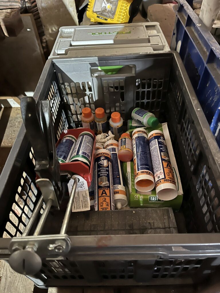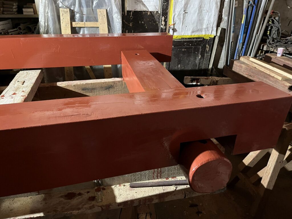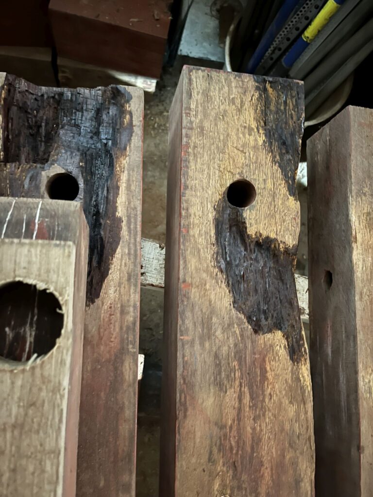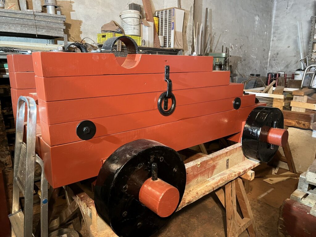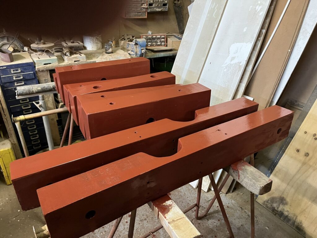 We gaan er weer met frisse moed tegenaan. Het affuit dat we uit elkaar hebben gehaald voor een grote renovatie is nu voldoende gedroogd. We proberen zoveel mogelijk balken te hergebruiken door deze goed te schuren en de grote scheuren en gaten met epoxy op te vullen.