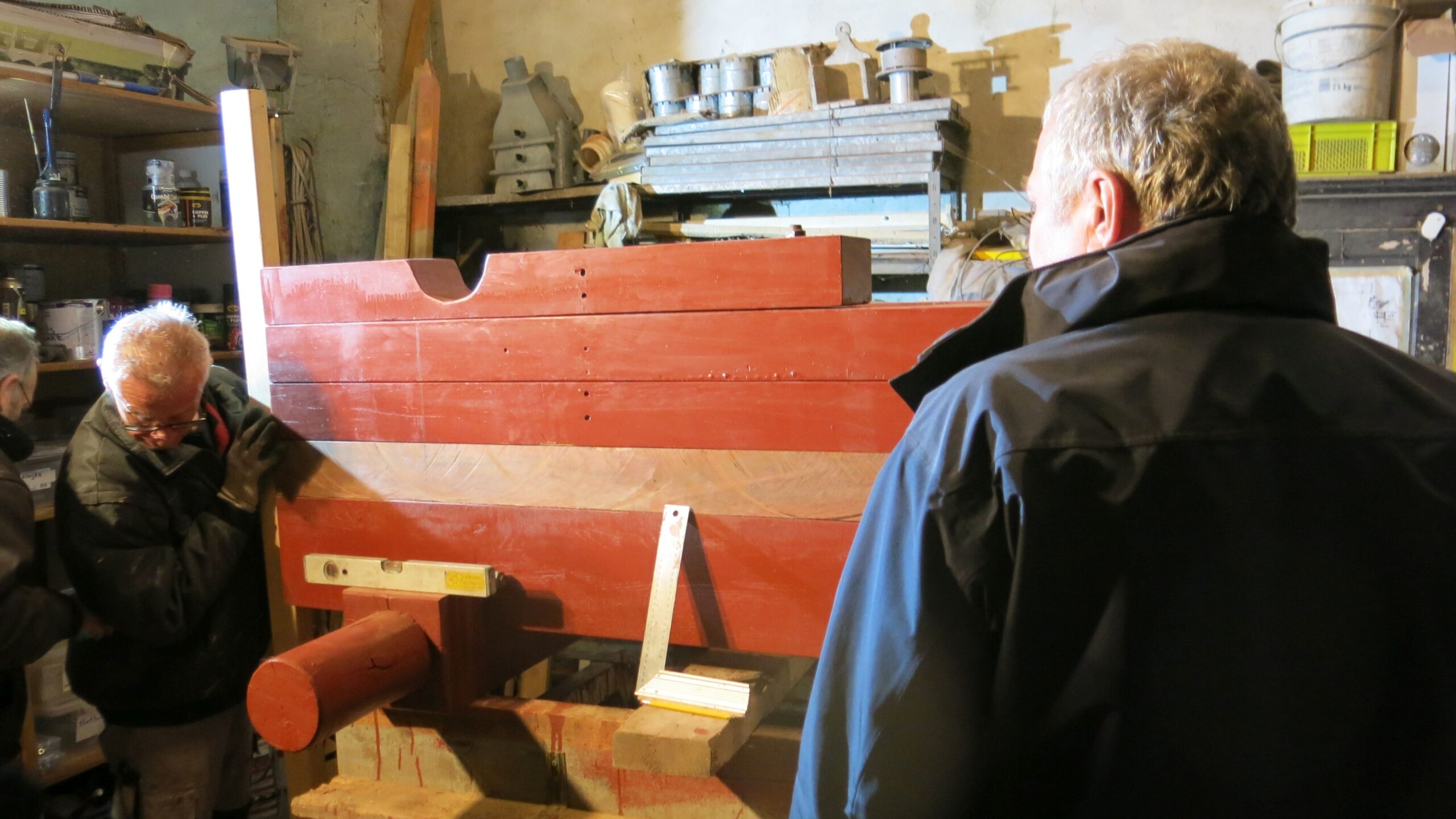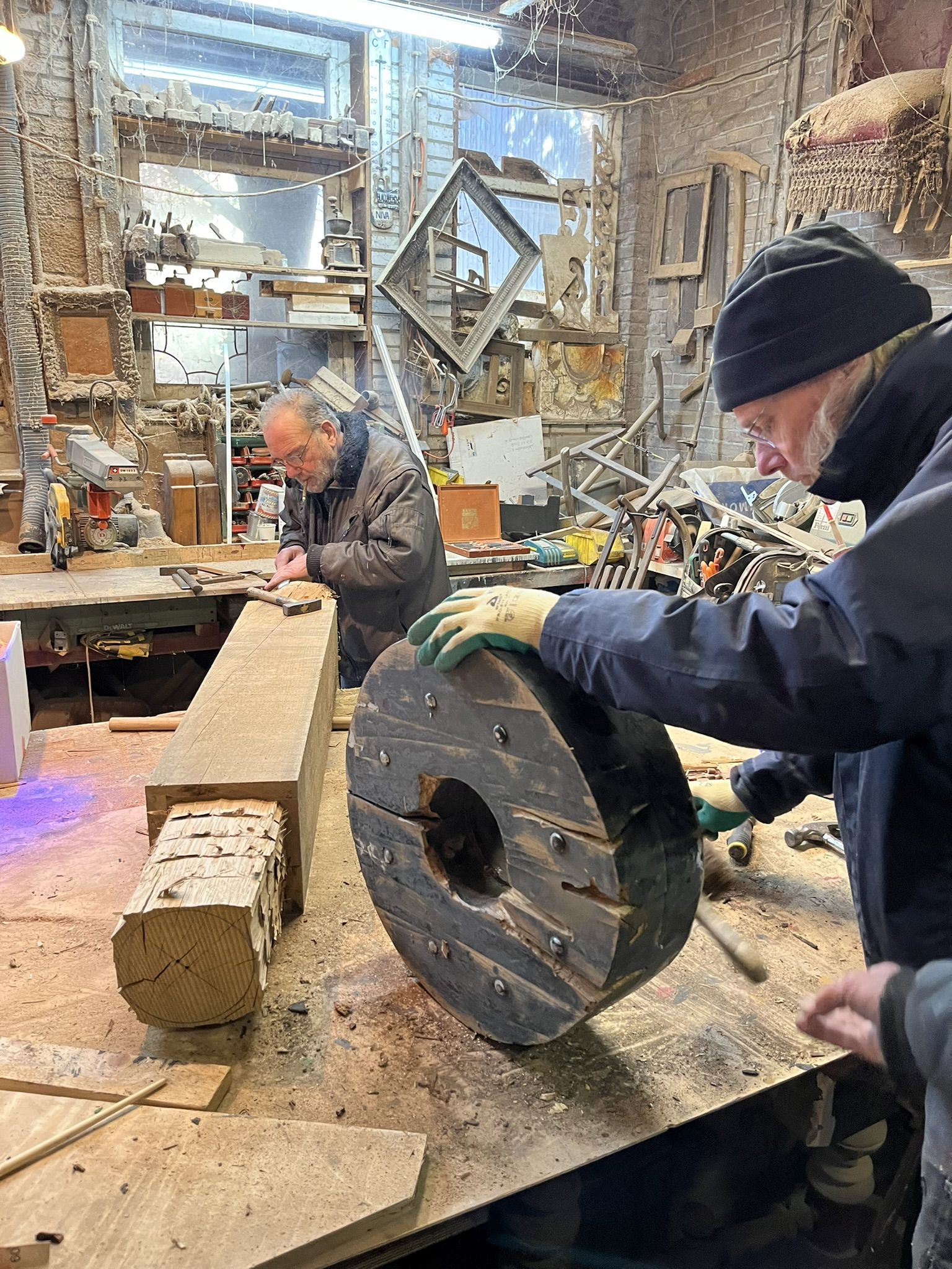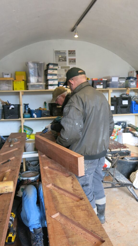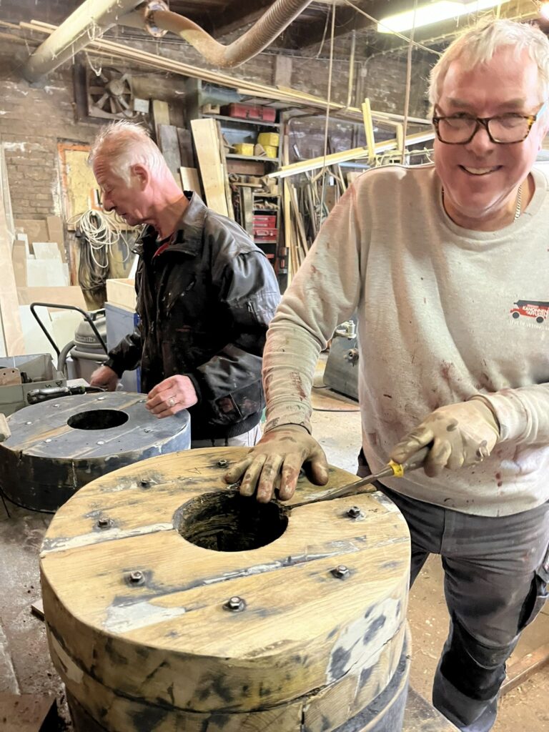 En ook de renovatie gaat door. Helaas moeten er ook nieuwe wielen gemaakt worden. Vorig jaar zijn er 2 verdwenen van het Bleijkers Bolwerk. Dus de massaproductie van wielen komt op stoom. Elk wiel bestaat uit twee delen, die weer uit 4 plankjes bestaan. Deze worden per 4 aan elkaar gelijmd en de beide helften worden dan van bet asgat voorzien. Dan worden de buitenkant gezaagd. Vervolgens worden beide helften aan elkaar gelijmd, geschuurd en nog met bouten erdoor stevig aan elkaar gemaakt.