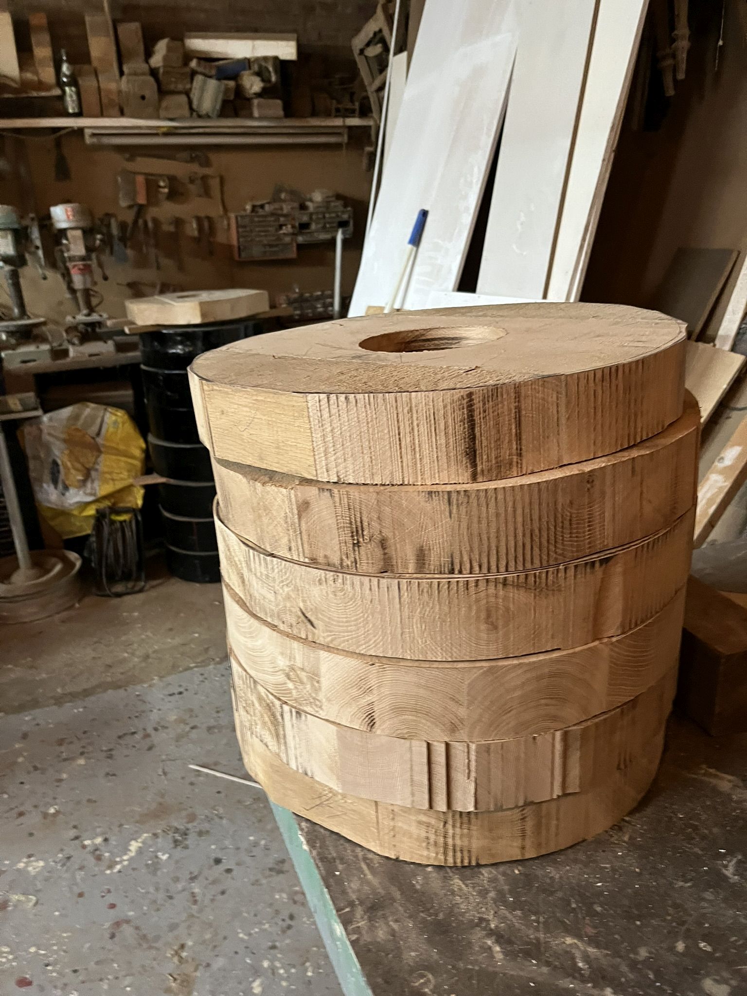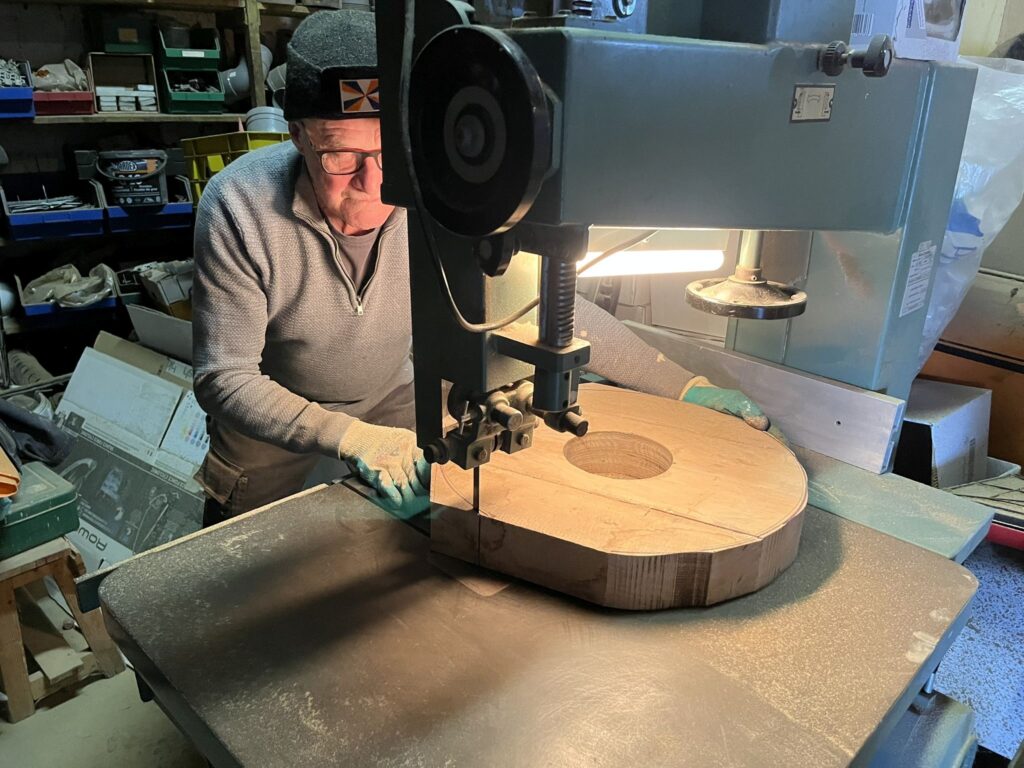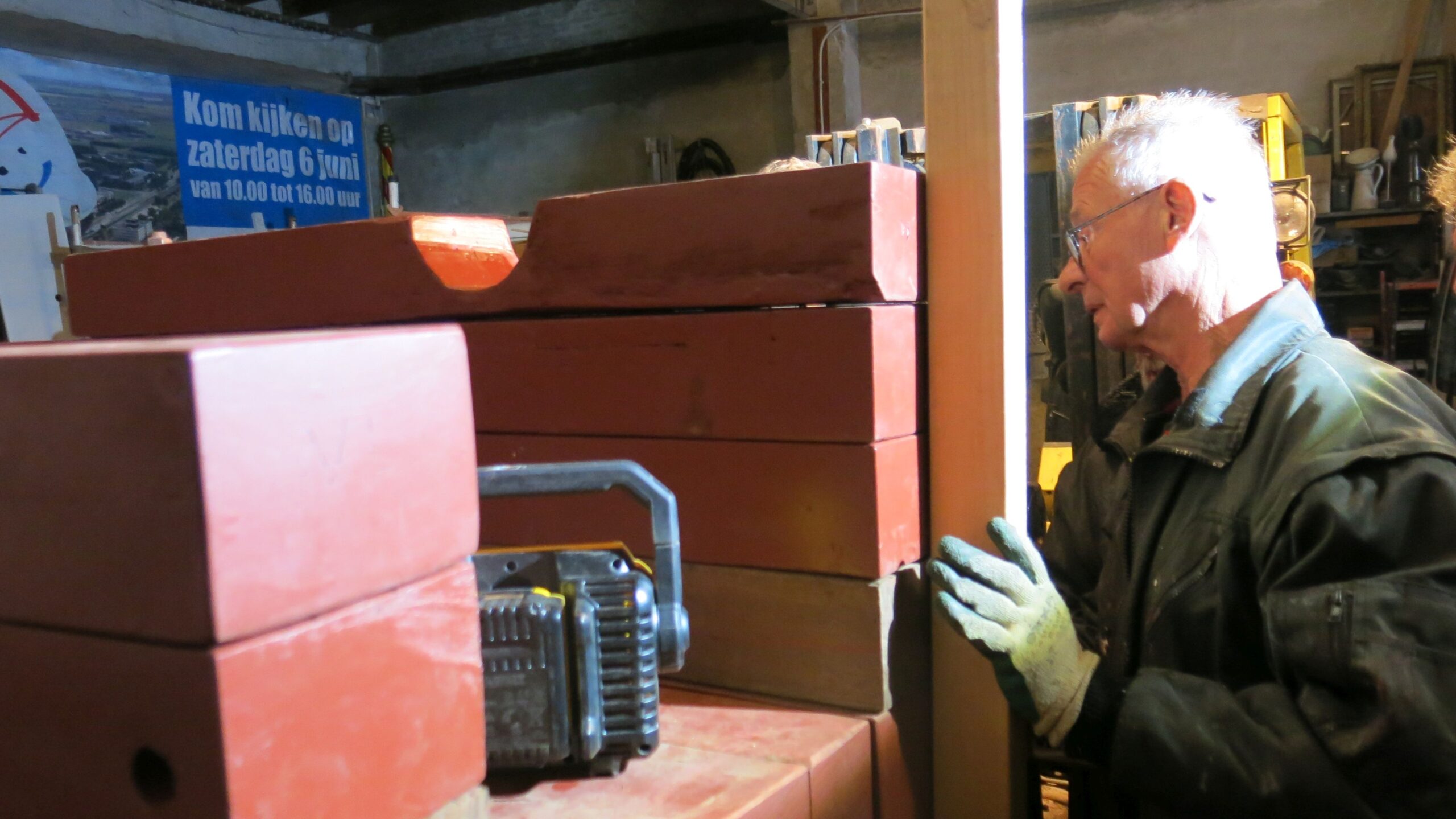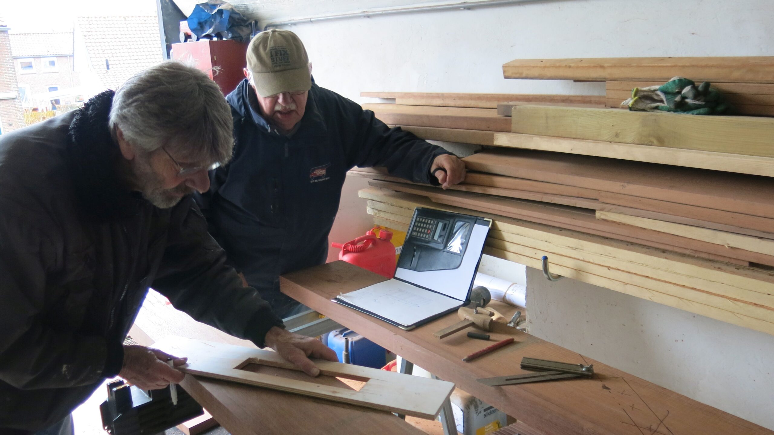 En ook de renovatie gaat door. Helaas moeten er ook nieuwe wielen gemaakt worden. Vorig jaar zijn er 2 verdwenen van het Bleijkers Bolwerk. Dus de massaproductie van wielen komt op stoom. Elk wiel bestaat uit twee delen, die weer uit 4 plankjes bestaan. Deze worden per 4 aan elkaar gelijmd en de beide helften worden dan van bet asgat voorzien. Dan worden de buitenkant gezaagd. Vervolgens worden beide helften aan elkaar gelijmd, geschuurd en nog met bouten erdoor stevig aan elkaar gemaakt.