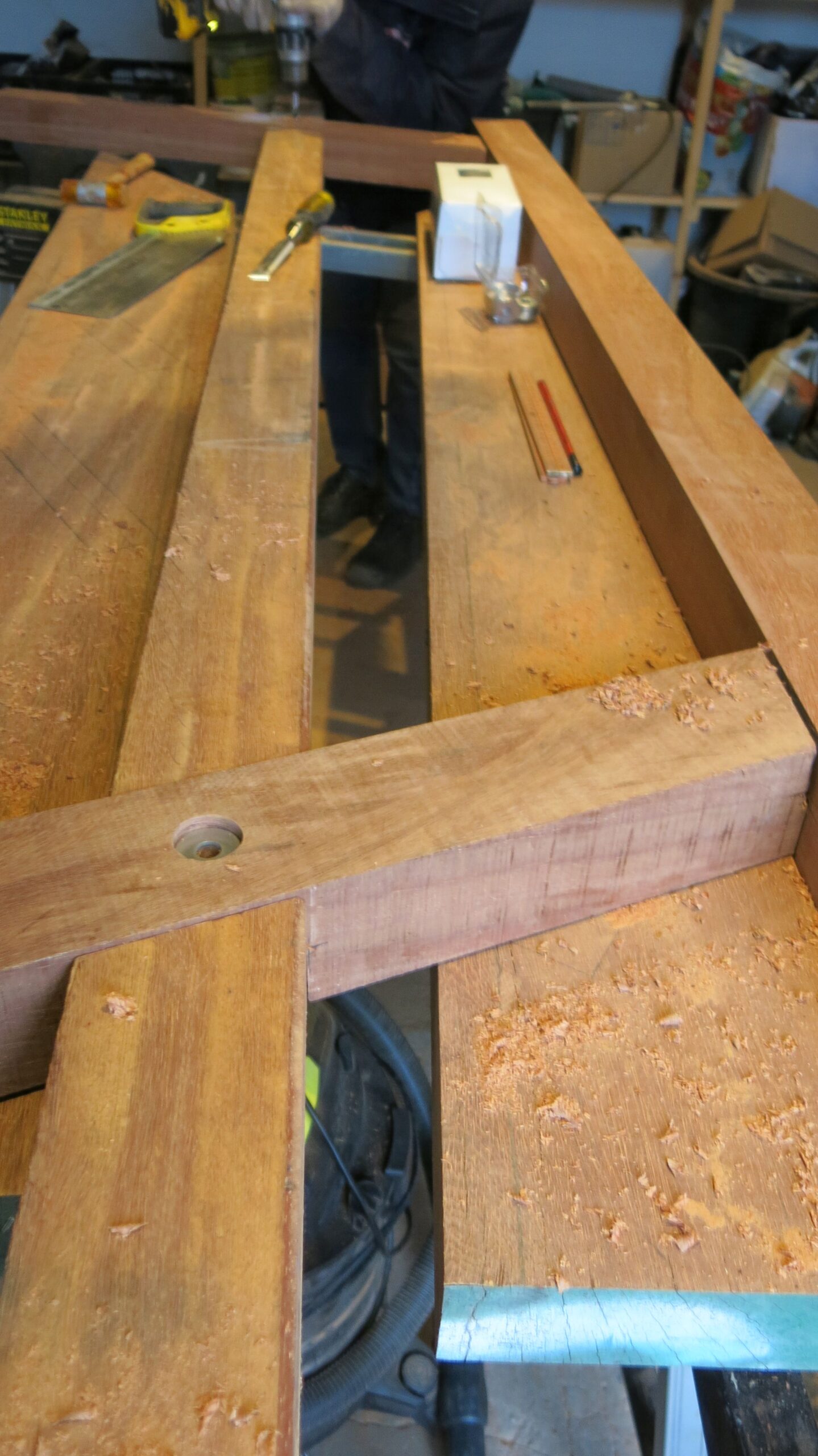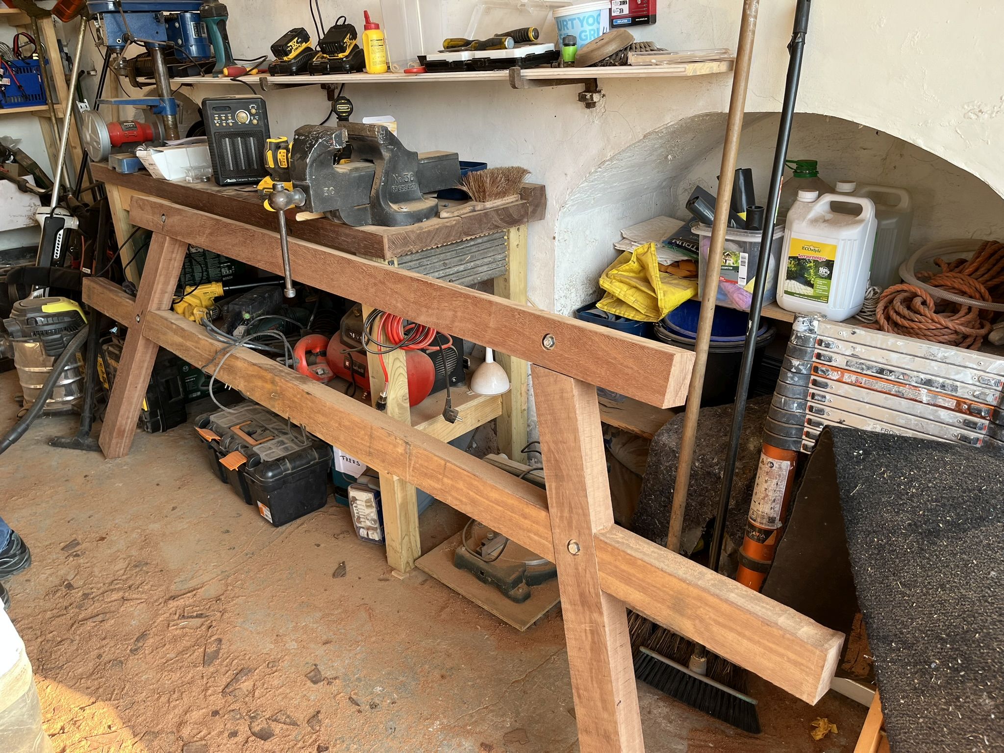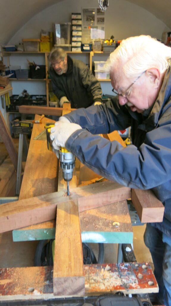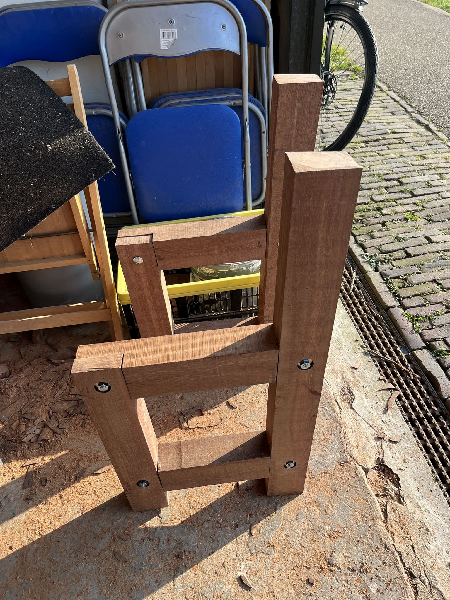 Het begin van de tafel van 4 bij 2 meter voor Bastion III. Dit zijn de drie poten, gemaakt van Azobe. Ook komen er twee banken aan vast.
