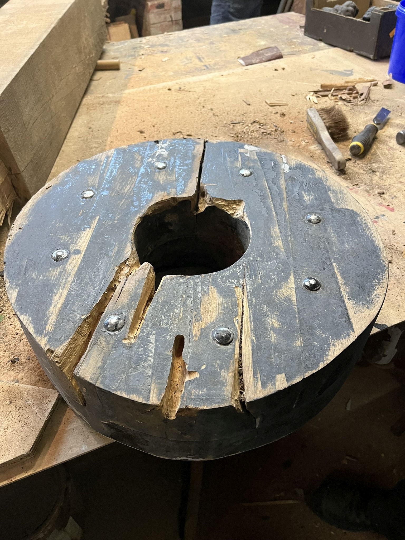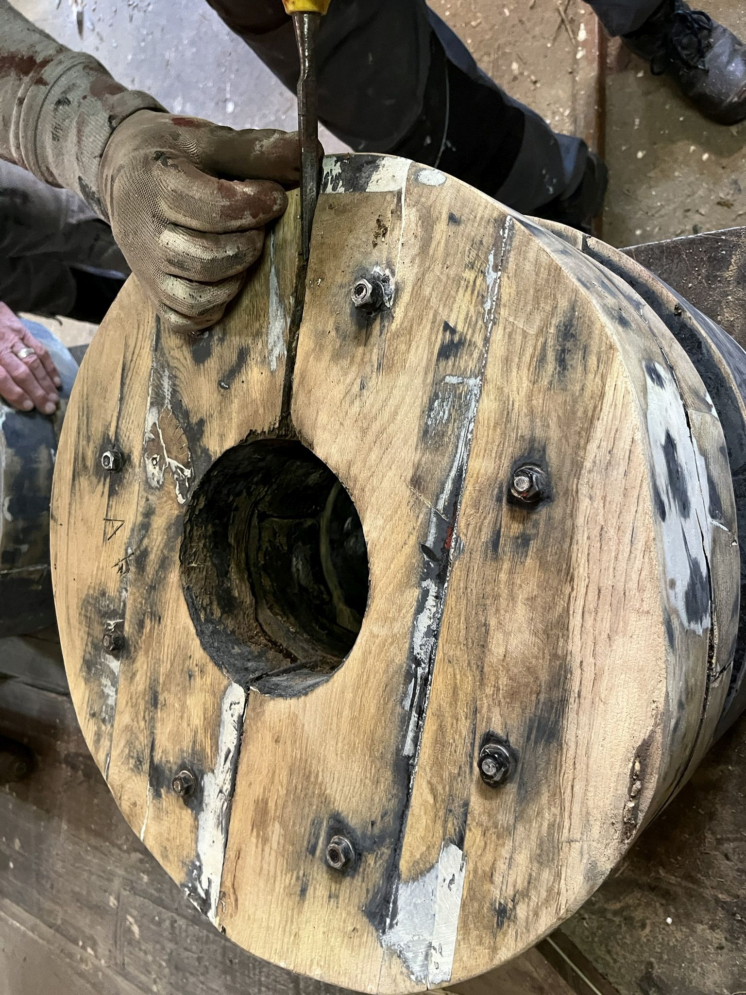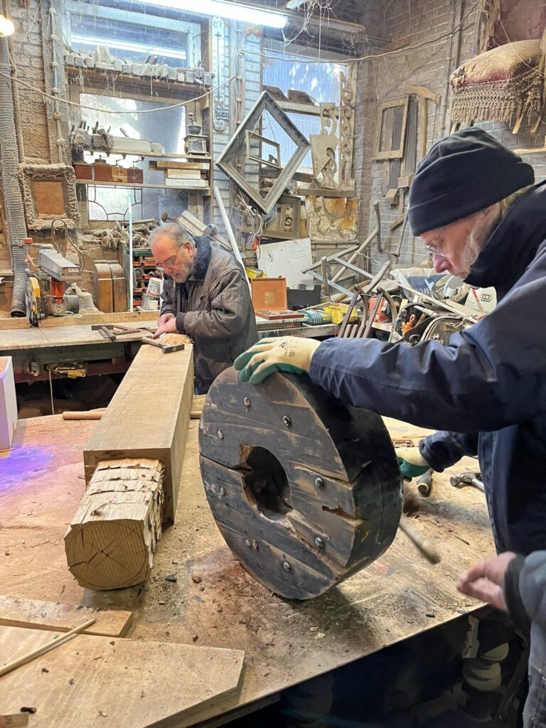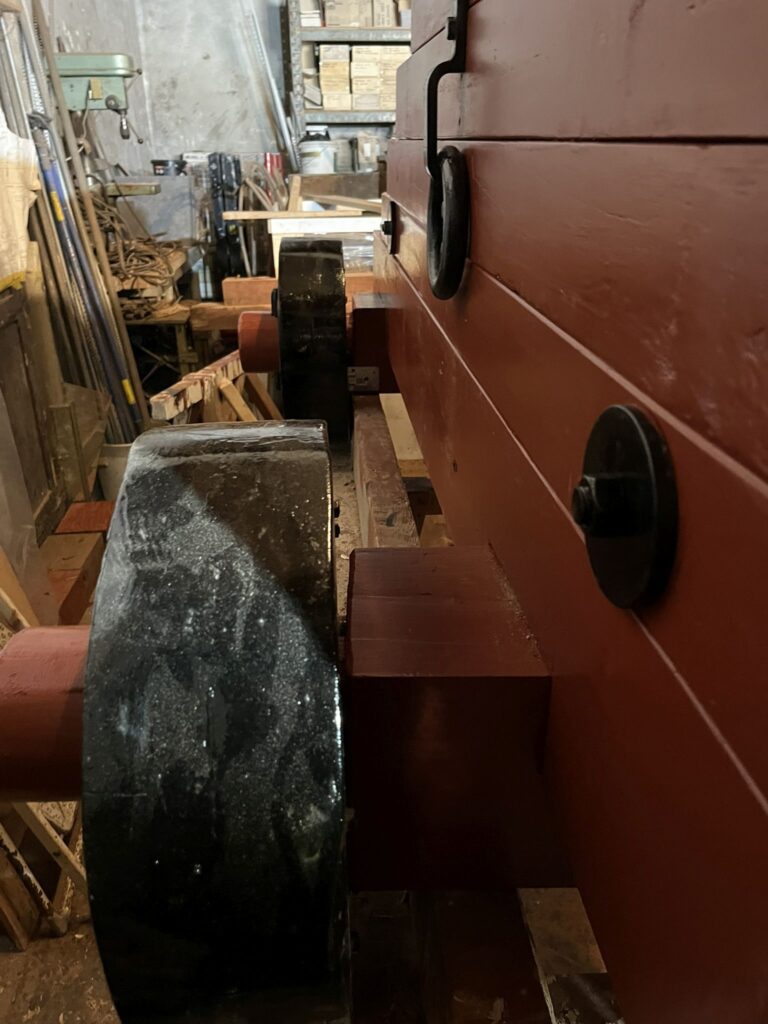 De wielen zijn een kwetsbaar onderdeel van het affuit en worden grondig aangepakt. Indien nodig worden ze uit elkaar gehaald, maar altijd grondig geschuurd en de scheuren opgevuld met epoxy. Foto